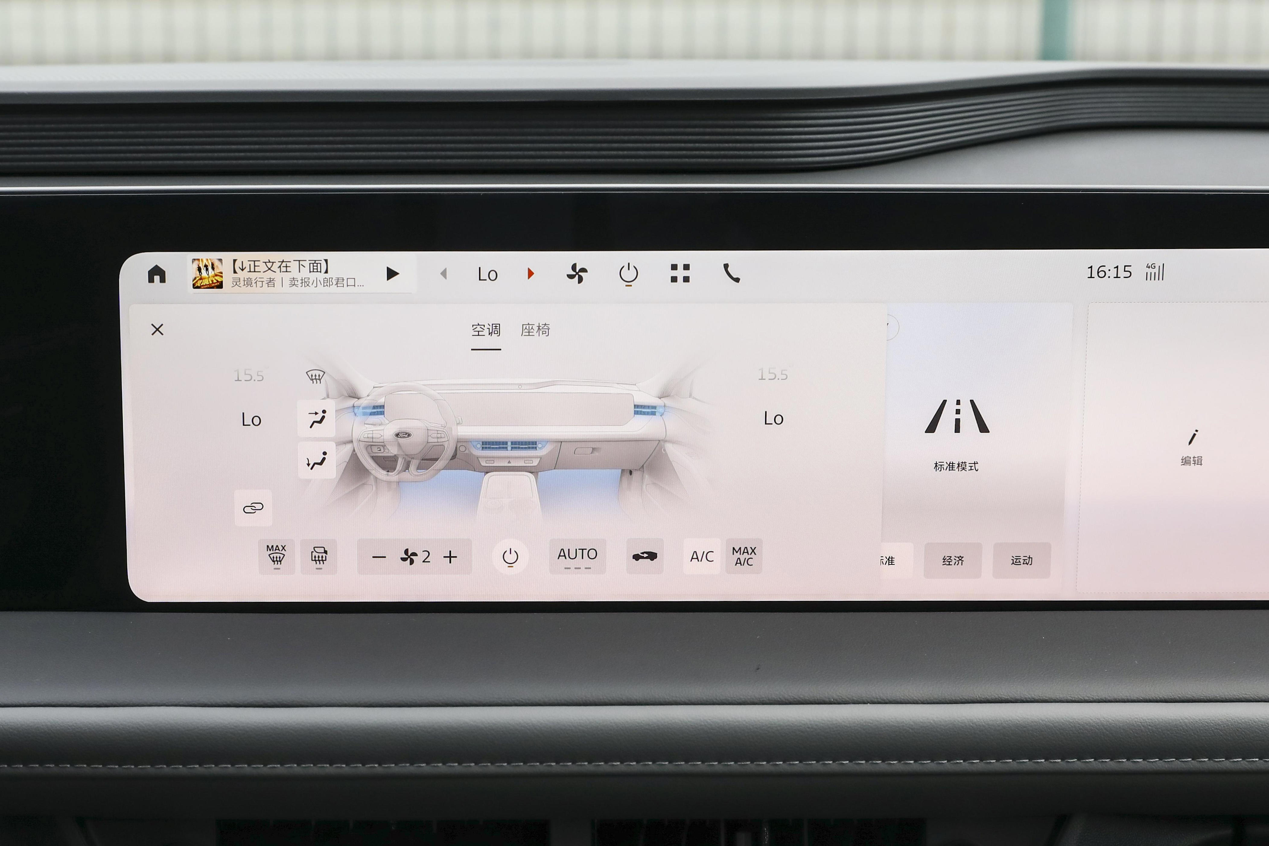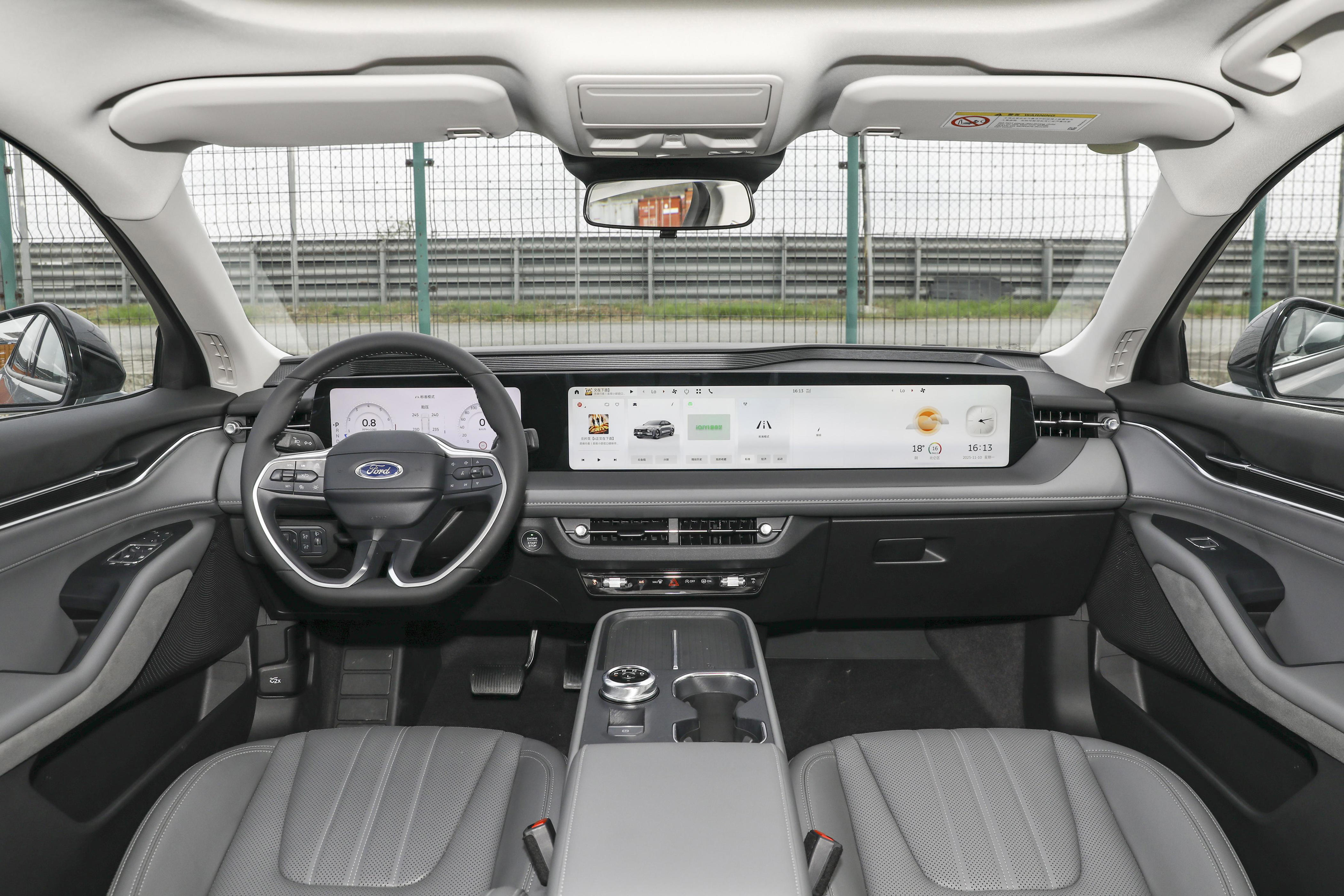 内饰设计方面,座舱是那种环抱式的,灵感来自航空机翼,中央扶手区用了游艇悬浮的设计,再加上大面积软质材料包裹,摸起来手感特别细腻。最吸引人的还得是那块1.1米长的贯穿式大屏,27英寸4K分辨率加上旁边的12.3英寸液晶仪表,几乎占满了整个中控台,科技感十足但又不显得乱。而且,福特这次还特意把空调和音量调节的实体按键给加回来了,现在好多车都流行去掉物理按键,但福特这么设计,既保证了盲操的安全性,又提高了操作效率,真的挺实在的。