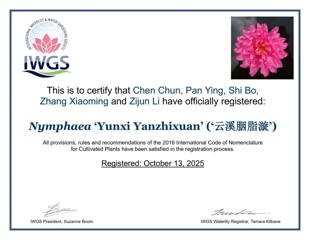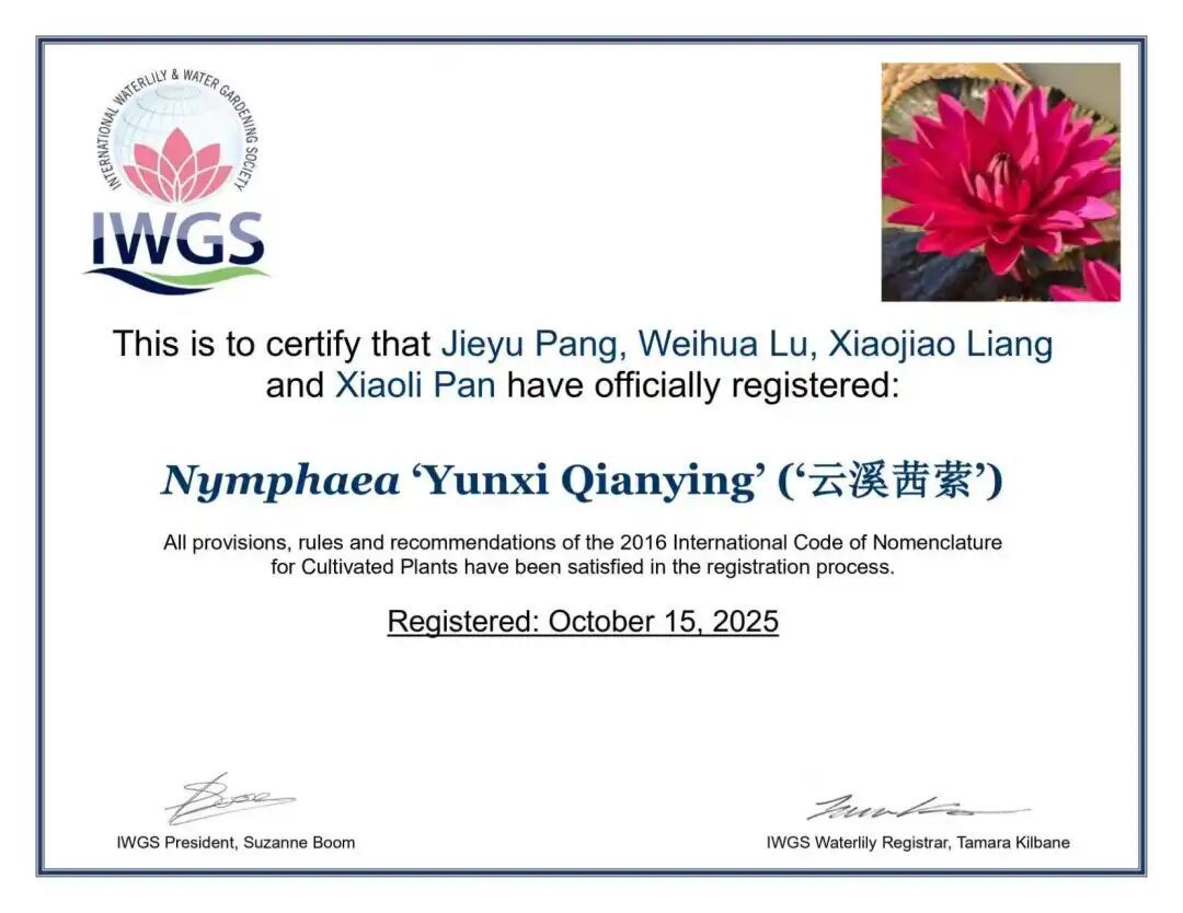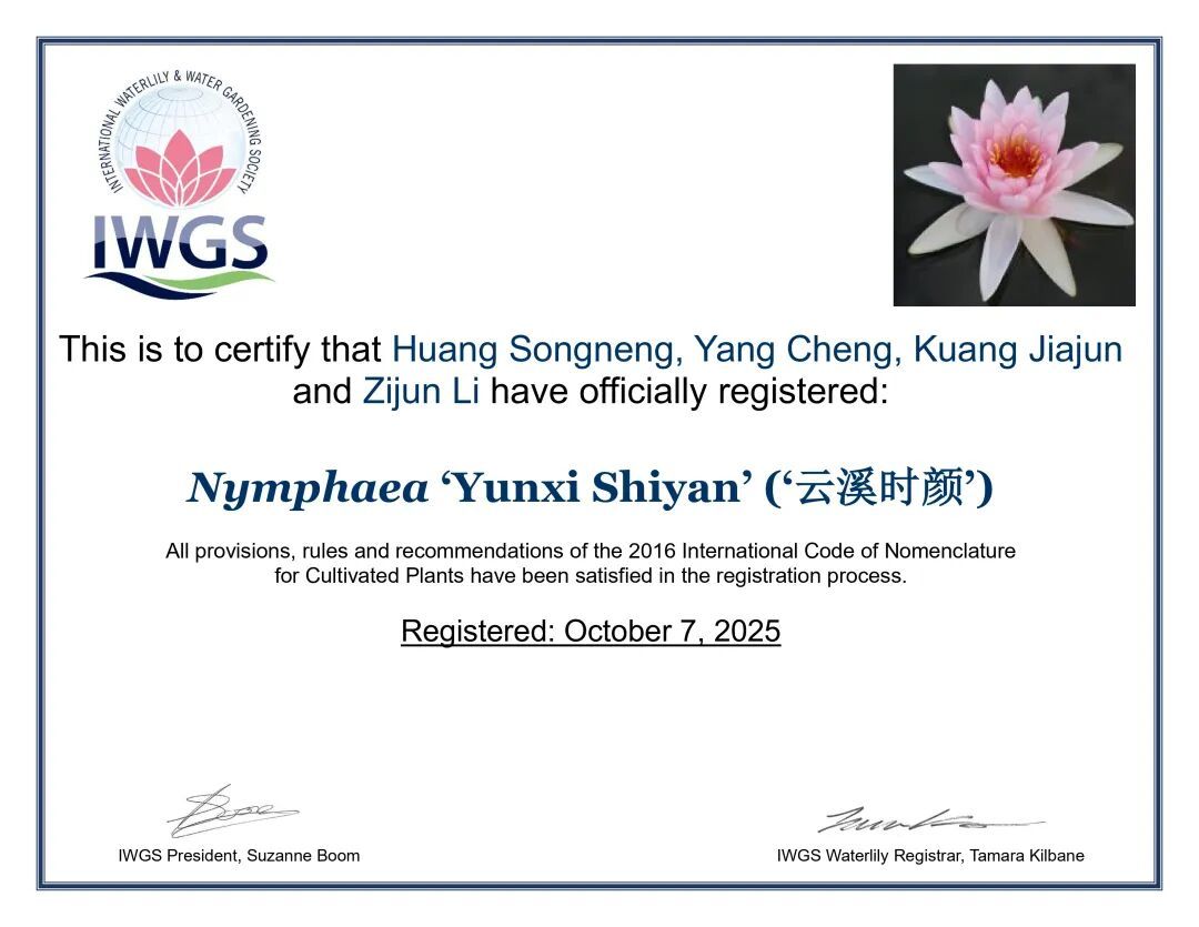 继2024年‘云溪茈锦’成功获得国际登录后,广州云溪植物园再传捷报:三款自主研发的睡莲新品种——‘云溪茜萦’‘云溪时颜’‘云溪胭脂漩’近日同时获得国际睡莲与水景协会(IWGS)登录认证,标志着我国水生植物育种实现新突破!
